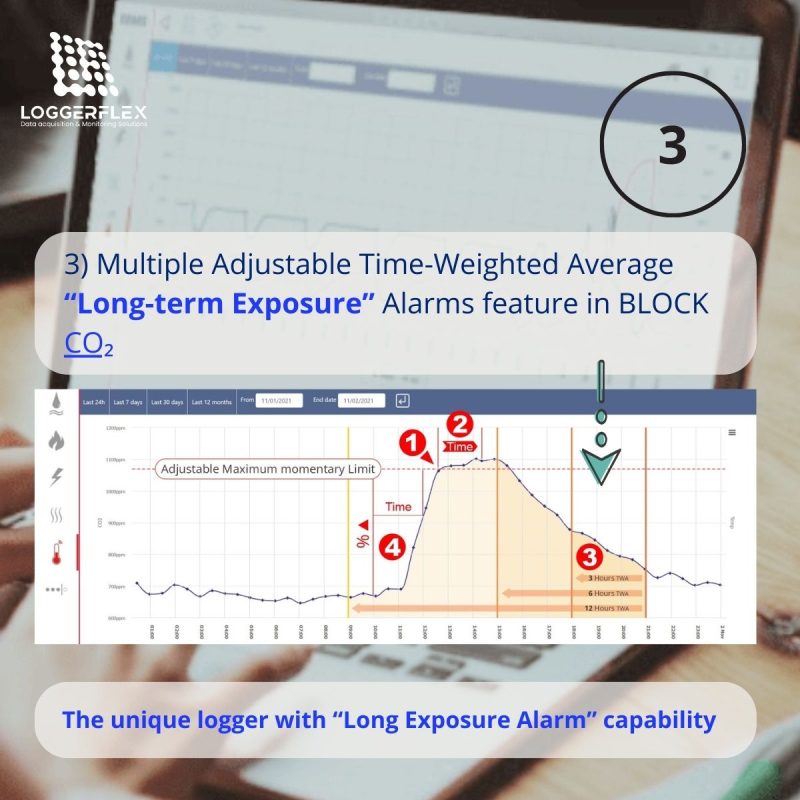‘BLOCK CO₂’ can continuously monitor the CO₂ level to ensure compliance with various long-term exposure regulations. Users can define rules based on CO₂ intensity levels and duration of exposure, and the system will send an alarm if long-term exposure is detected, calculated based on time-weighted average values.